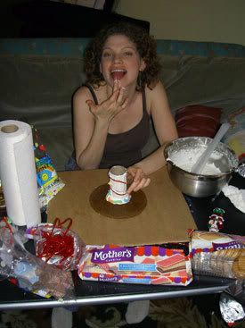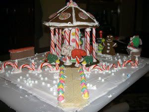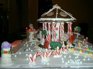 If you'll remember...Lisa and I have a long-standing tradition of Gingerbread House-ery. It doesn't usually happen prior to Christmas, but as long as we tackle it before the New Year, it counts. Last year's effort was a "House of Debauchery". (Previous efforts included "Alien Crash-Landing" and "Santa in a Mack Truck"). This year was less subversive and more...pastel. Please remember, however, that the purpose of building the gingerbread creations is not great artwork...it's all about the sugar high.