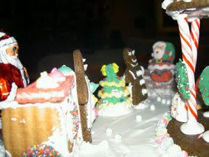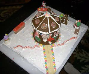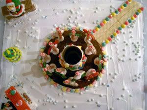 And here's the pretty pretty carousel. The final product had candy cane poles with circus animal...well, animals...aaaand candy cane fence with a sugar wafer walkway and a big Santa at the carousel controls and a gummy sugar santa sitting on a bench watching and a mommy gingerbread lady looking on and a gummy sugar tree and another bench aaaaaaand...that was a kick-ass run-on.
